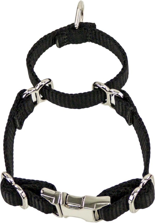 The 2 Way Adjustable Martingale Collar is made of heavyweight nylon webbing, has metal hardware and two slide adjustments. It has a metal, contoured side release buckle which we will personalize and engrave for you.