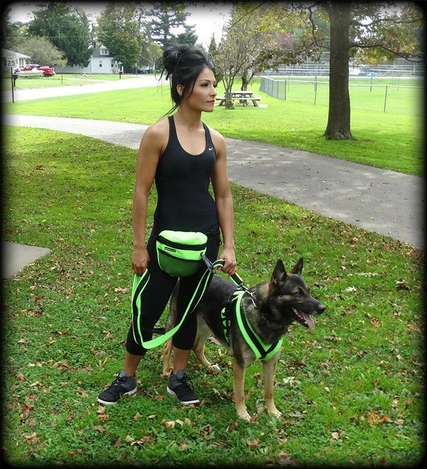 The EEZWALKER Handler Bag with Bungee Leash is a bag and leash combination that attaches around the handlers waist. This is convenient for working, walking, and jogging your dog allowing your hands to be free from holding the leash. I use hands free leashes because the dog learns to walk or run with my gate. The stretch in the bungee leash is a great feature because the give of the leash causes the leash to have smooth movement between the dog and handler. If you are jogging and stop quickly there isn’t a jerk in the leash but time for the dog to have an extra step to stop. Having your hands free makes jogging, pushing a stroller, pushing a grocery cart, opening doors, and loading the dog in and out of vehicles very useful and accessible.