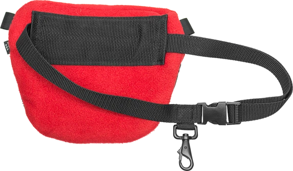 The handler bag attaches to the waist with the use of an adjustable belt. The belt is made from heavy poly nylon and is adjustable. The belt will fit waist measurements from 28-52”. The handler bag can be removed from the belt and the belt used alone with the leash. Stitched into the belt is a black metal spring bolt snap for attaching the bungee leash. The bungee leash is covered with fleece and features a soft looped handle. The bungee leash can be used separately or attached to the belt snap. The leash length unstretched is 36”, leash stretched approx 52″. Made in the USA