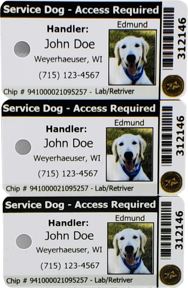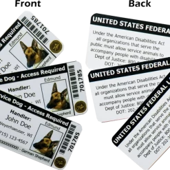 Service Dog IDs will have the ADA (American with Disabilities Act) information on the back of the ID. This information addresses your rights and protects your full access required by law to public buildings.