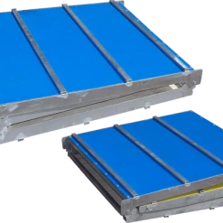It features our exclusive unique laser cut, folding hinge system. Due to our design, the A-Frame is very easy to take apart for storage and transporting. You do not need a transport dolly to move it. When taken apart, each side of the frame folds together and weighs forty-two pounds. The top deck of this frame is the traditional blue and yellow colors and has a non-slip surface. The aluminum structure is not only portable but very sturdy.