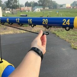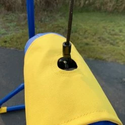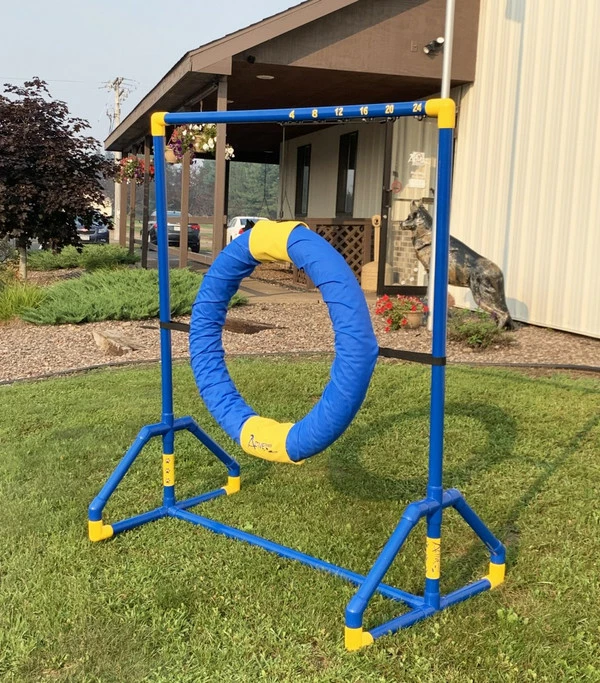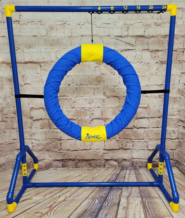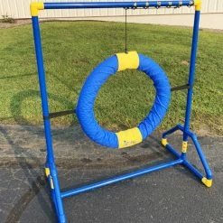 The Standard Tire Jump is AKC competition size. The tire has a 24” center opening, there are 6 height adjustments from 4” to 24”, and there is 8” between frame and tire. Easy to follow directions are included. The tire jump bottom leg A-frames are glued for easy assembly. The tire is fully assembled and shipped assembled. The Standard Tire Jump and Tire Ring are blue with yellow highlights. It can be used indoors or outdoors.