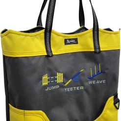 This tire jump is very simple to use with the altering height adjustments. You simply move the hook to the coordinated height number. This will give you the distance that the tire is spaced off the ground. The tire is covered in outdoor fabric. No tire ridges to catch the dogs toe nails. There is NO TAPE on this tire. The tire has attractive yellow top and bottom center sleeve pads. This makes a distinction showing the dog the center of the jump and the bright color shows the difference. These two attractive sleeve covers are removable and washable. This tire does not breakaway. The tire sides have adjustable tethering straps.