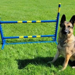 The Activedogs.com Fixed Base Jump is part of the “Premium Series” line of agility equipment. It measures 36” tall and meets standards for AKC, USDAA and TDAA trials. The Fixed Base Jump frame poles are 1.25” O.D. This jump comes with a fixed center bottom pole. The Fixed Base jump frame is blue with yellow vinyl wraps on the upright poles and on the jump bars. There is no tape on the jump and comes already wrapped for you. This jump comes with two jump bars. The 48” displaceable jump bars can be set from 4” to 26” in height.