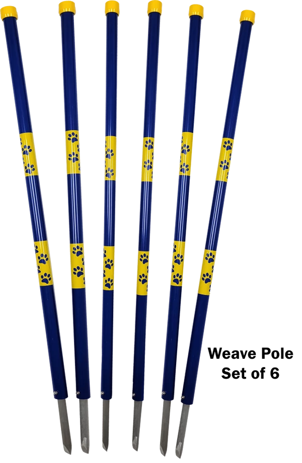 One word describes these weaver poles, and that word is “Substantial”. Most in-ground weaver poles are not that great but the Activedogs.com Agility In-Ground Weaver Poles are the exception. They are very sturdy and well built. These poles are attractively done. They are wrapped in yellow paw print wraps; the vinyl wraps are placed at 10” and 20” above ground. So, there is no taping to be done on the poles when you receive them. The top pvc caps are yellow, the wraps are yellow, the poles are royal blue. The in-ground posts are 5/8” thick and made from no rust aluminum. The posts are bolted all the way through the poles.