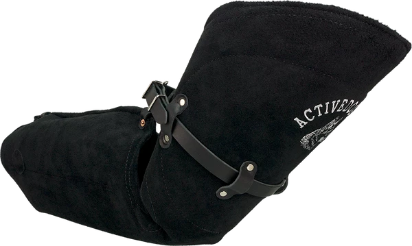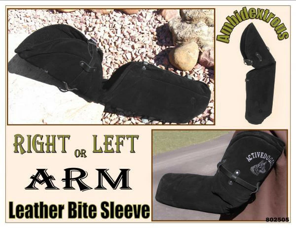 Our Ambidextrous Bite Sleeve has a sleeve and base that is constructed of heavy, suede leather. The leather cuff is comfortable and can be worn on either arm.