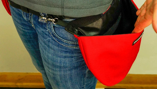 Belt Loop Bait Bags are very convenient as they snap on and off your pants belt loops. You can place them anywhere that works for you while training. Sometimes I train with the bag on my side and other times I want the treats to be hidden so I snap the bag to my pants back belt loops. You can wear multiple bait bags at the same time; one may hold the treats and the other a ball reward. They are double layer construction. The interior is made from a water resistant vinyl so it is very easy to wash out, making clean up a snap. The exterior is made of durable Cordura. The two swivel snaps are attached with elastic webbing giving the bag room to adjust while attaching to your belt loop. The large bag has hook & loop inside the top edge so the bag can be closed if desired. These Belt Loop Bait Bags come in three sizes. Size Large 10” x 9”, Small 8” x 6”, and the Mini Bag is 5.5” x 5.5”. I personally use all of them for different type of reward training, I most commonly tend to grab the size small because it is deep and when not using it as a food reward bag I store my phone in it. There are two colors to choose from red or black. MADE IN USA. Purchase separately or in a set of all three bags for a discounted price.