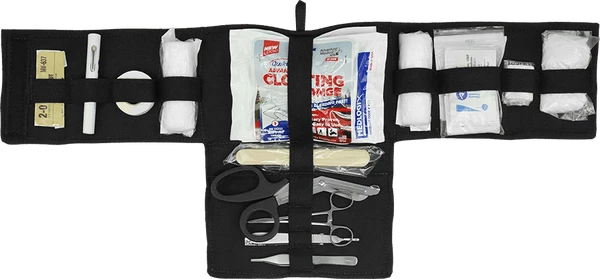 The MOLLE First Aid Field Trauma Kit is designed to be used with the K9 Tactical MOLLE Vest, The outer bag attaches to the vest with two webbed MOLLE sticks, included with the MOLLE First Aid Field Trauma Kit. This first aid kit address two emergency trauma issues of first aid; bleeding and bone breaks. In an emergency situation you can quickly see and access the medical supplies and instruments with this fold open trauma kit insert. The inner piece of this MOLLE K9 First Aid Field Trauma Kit comes out of the bag separately so you can have the supplies at your fingertips. The insert is padded so nothing sharp can poke through the bag insert. It is a trifold padded insert with elastic hold down straps for the supplies. This feature is a safety feature as time is an issue during an emergency and digging in the bag for your supplies takes time. The outer bag has a red embroidered medical cross on the front of it so it will quickly be recognized as the first aid supply bag. The MOLLE K9 First Aid Field Trauma Kit comes with exterior zip top bag, size 6x8x3, and trifold interior bag insert. Supplies included in the kit are Chrome Gut Sutures, Penlight, Tweezers, EMT Scissors, Scalpel, Forceps, Latex Gloves, Tourniquet, Wood Splints, Tape, 2×2 Gauze, 4×4 Gauze, Non-Adherent Pads, 4” Gauze Rolls, Antibacterial Wipes, Povidone Prep Pads, Instant Cold Pack, and Clotting Sponge. USA MADE
