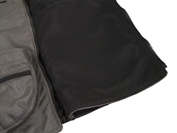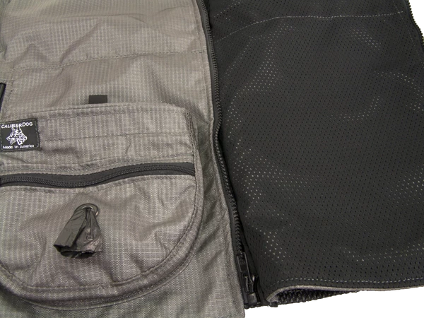 The exterior of the CaliberDog Handler Vest is made from beautiful steel gray Ripstop fabric. Ripstop fabric is light weight yet at the same time durable and tough. The interior of this vest is lined with moisture wicking fabric to keep you dry and cool when working in the heat. The front of the vest closes with a molded separating zipper. There is a back neck loop on this vest to hang up the vest when not in use. Every seam is double stitched for reinforcement. USA MADE