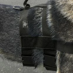 The CaliberDog Patrol Double Girth Harness is a heavy duty nylon webbed patrol harness that has two girth straps. Both girth straps are adjustable with slides so there are no floppy strap ends and close with side release buckles. The chest strap of this harness is also adjustable so the harness can sit back behind the dogs front legs where it will be comfortably worn on the dog. Each side of this patrol harness has 6” of hook and loop so ID panels and patches can be worn for identification. The top back of the harness has two large metal D-rings; these D-rings are large enough that the handler can fit their fingers into to lift the dog in harness. Also on the top of this harness is a webbed handle. The entire harness is blacked out with black webbing and black hardware. USA MADE