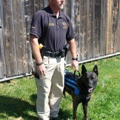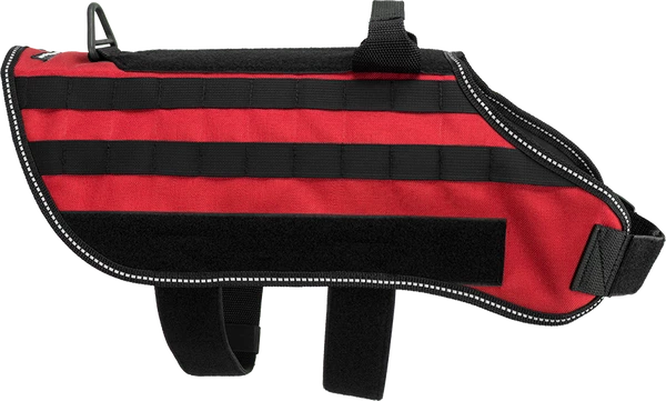 There is a row of 2″ hook and loop, and 2 rows of 1″ MOLLE straps on each side of the vest so accessories can be used with it. ID panels or patches can be attached to the top hook and loop or the side hook and loop of this vest. The vest has double girth straps and a chest strap so it will fit securely on the dog. The adjustable chest/neck strap sits above the dog’s breast bone eliminating any gap at the neck area of the vest. The lay-flat handle can be stuck down to the hook and loop when it’s not needed.
