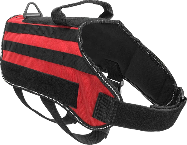 Designed in the traditional MOLLE fashion so you can use all MOLLE accessories with this vest. High quality poly webbing was used, and there are 13 colors to choose from with this vest. Comfortable wide grip handle and 1 V-ring which could be used with a leash. Made in the USA