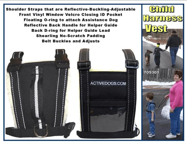 The Child’s Safety Harness Vest has many convenient features which help facilitate teaching and training a child to work with a service dog. The adjustable shoulder straps are made with reflective webbing as an added safety feature. The harness can easily slip over a child’s head. Since some children do not like anything touching their head, we have made these straps to buckle on and off. The bottom chest strap is elastic which gives the child full range of movement.