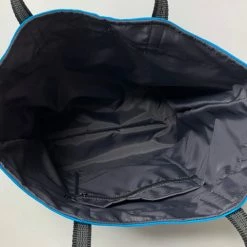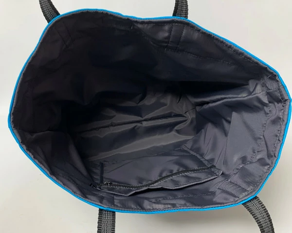 Very attractive color blocked large agility tote bag. Constructed inside and out with high thread count fabrics. This is not your average cheap tote bag. It is fully lined with two deep interior pockets. Outside are four more pockets at the lower bottom section of the bag front and a tri-ring to attach keys. I love the function of this large quality tote bag.