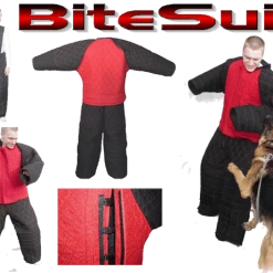 This is a medium/heavy weight suit, our Heavy Bite Suit is made from a combination of aerotex and french linen fabrics (bite Suit Material). The suit is padded to provide good protection. This suit is easy to get off and on. The jacket has hidden front closures; stand up collar and long arms to help protect your hands. The back of the jacket is cut slightly longer than the front to give you extra protection. The pants have padded shoulder straps for comfort. Open waist sides and leg bottoms for easy access. The waist of the pants is adjustable on each side of the pants waist. You will not find another suit of this quality construction for this price. Made in the USA. Bite Suit Material is a gray/blackish color and the Aerotex is a red color.