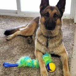 The Activedogs.com Fur Bungee w/Foam Ball Tug is so fun. The dogs just love it and it works well to motivate them to interact with us during training. The yellow foam 2” ball is a favorite of our dogs and the bright color attracts their attention. The plush faux fur stretches with a bungee interior. The handle is solid non stretch construction for good handle control. This plush tug will stretch from 24” to 34”.