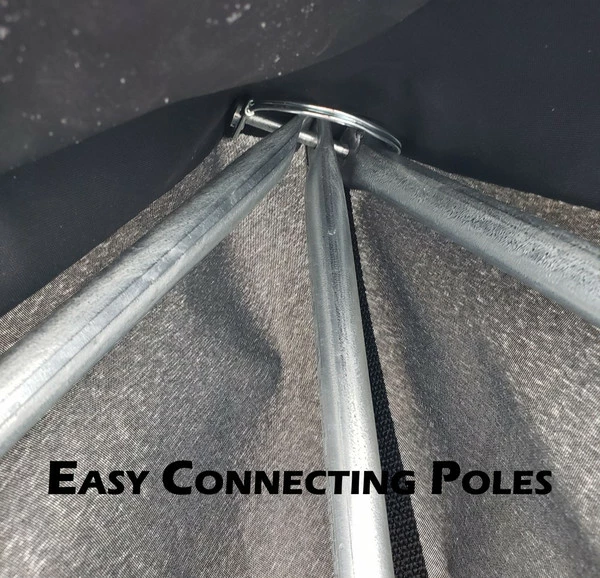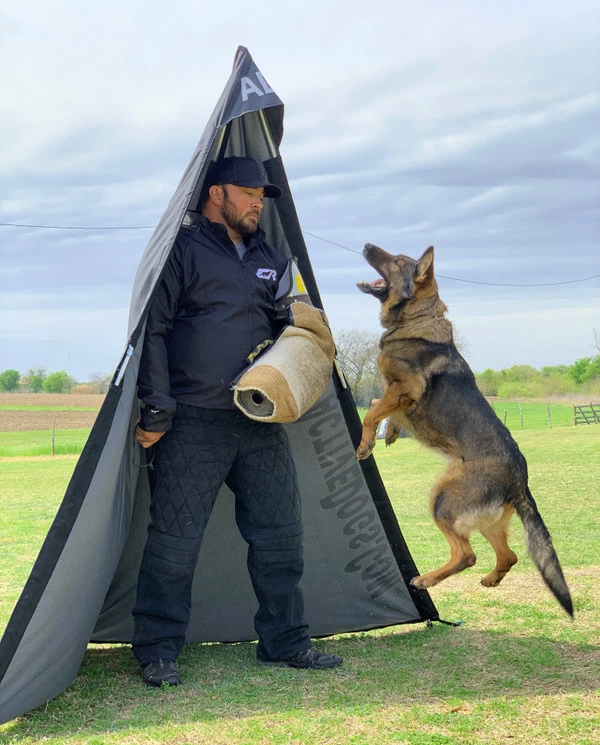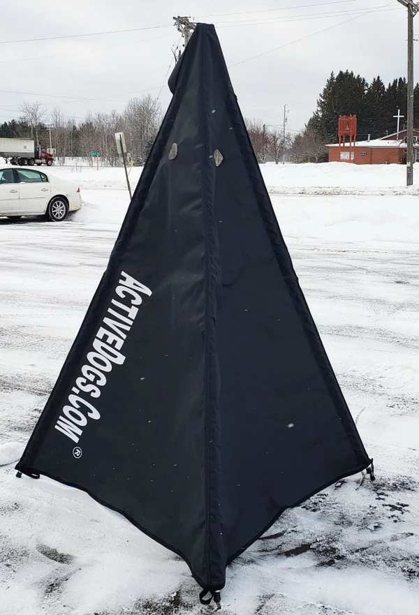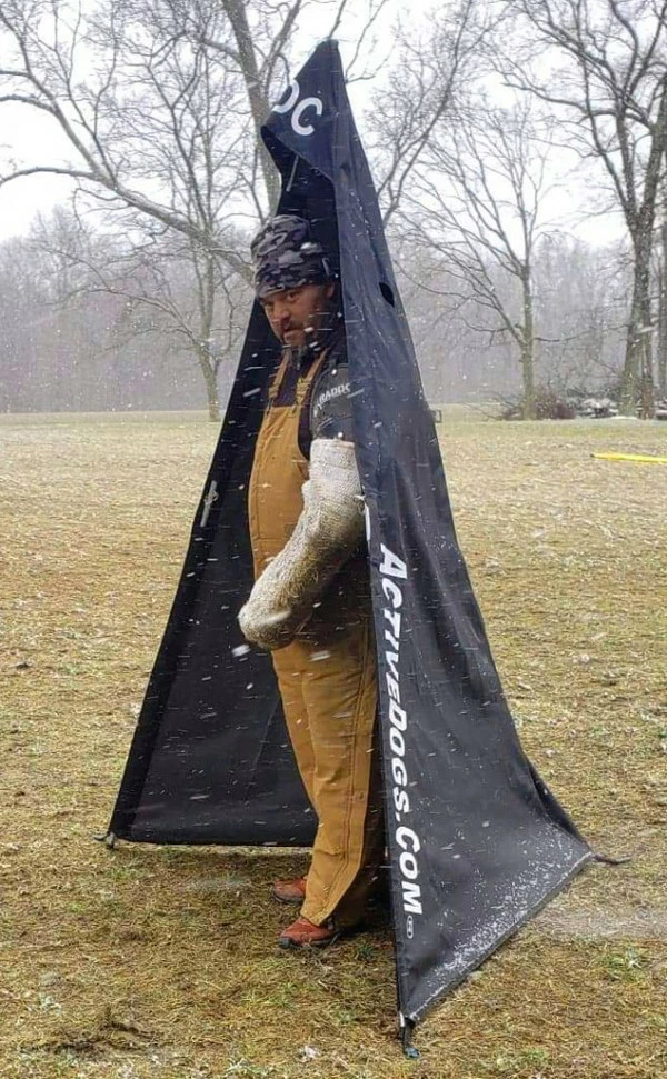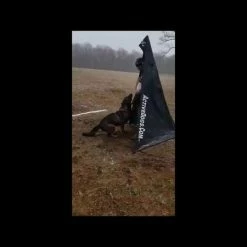 The 8′ Collapsible Schutzhund blind comes with easy to use poles that can quickly be collapsed down into 4′ poles and the blind simply folds in half to make transporting these blinds location a breeze. When not in use the blind can easily be folded up and stored in the drawstring storage bag. The top of the poles are held together with a locking pin system that easily snaps open should you want to remove the poles. These poles have gripped rubber tip bottoms so the blind can also be used on a hard surface. When using on grass the blind comes with a sewn loop and stakes to easily stake down the blind to give it extra strength and can withstand even the windiest of days.
