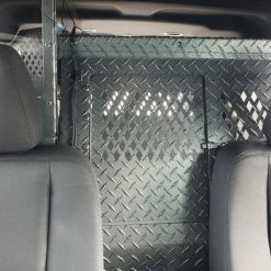 12″ x 15″ opening with door provides easy access to K9 from the front seat to be able to calm the canine. This vehicle specific design is very easy to install and bolts securely to vehicle floor with simple hand tools. Designed to maximize use of front seats. Manufactured from heavy-duty aluminum for maximum durability. Beautiful & long lasting black/silver vein powder coat finish. Works great with our 3 Drawer Locking Storage Cabinet. Approximate kennel inside dimensions: 34″ (front) / 26″ (back) W x 42″ L x 28″ H Door and window guards are included free of charge when you purchase a Police K-9/Passenger Vehicle Insert. These guards are cut from a single piece of 18 gauge steel and have no seams or welds. CNC machining is used for an exact fit on your vehicle. Durable black powder coat finish. Includes self-drilling screws for easy installation with pre-drilled mounting holes.