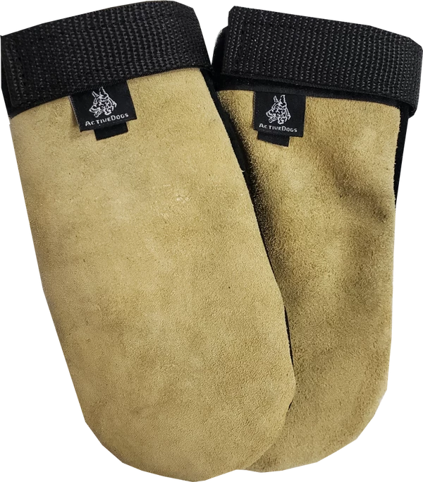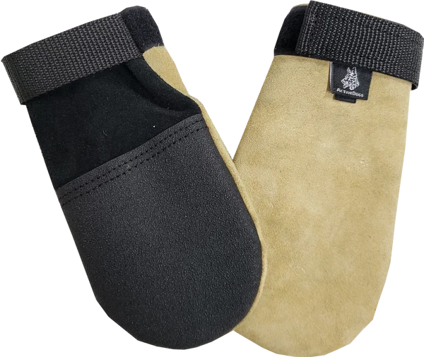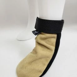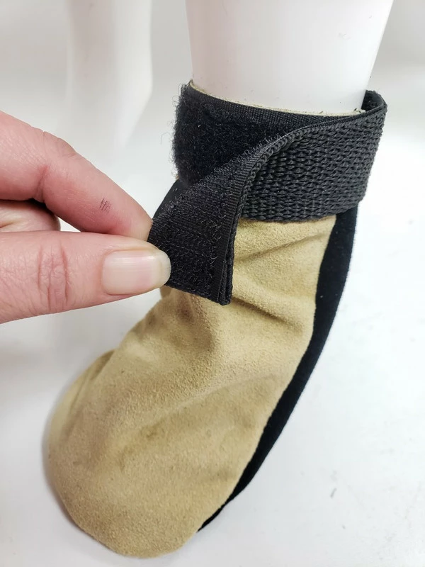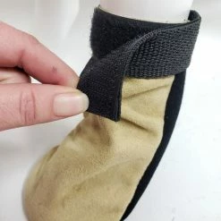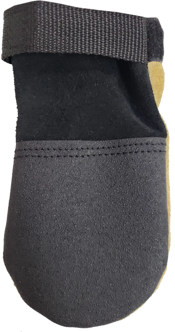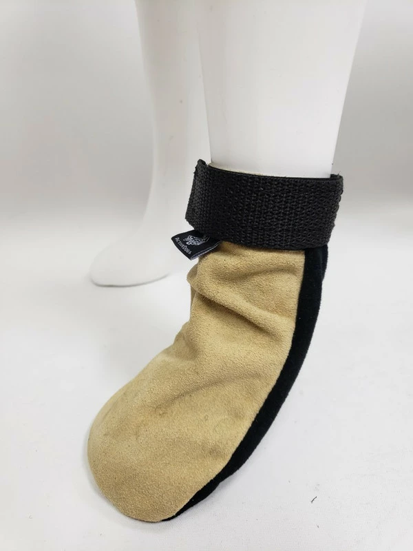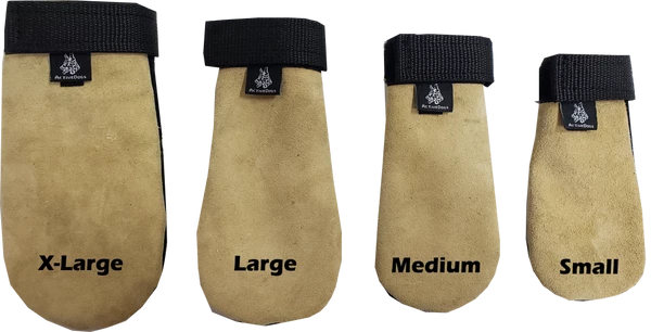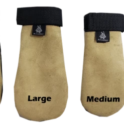 Leather Suede Dog Booties are made of soft suede leather. The back of the boot is made from black leather and the front of the boot is made from tan leather. The bottom pad of the boots is reinforced with a non-slip PVC resin material. This gives your dog extra grip while walking and it makes the bottom pad water resistant. These Suede Leather Dog Booties are stitched together not glued. At the top of the boot is a Hook and Loop strap closure to secure the boots around the dog’s leg. The suede boot makes a soft boot that easily wraps around the dogs leg. These boots are sold in sets of 2. Most dogs have smaller back paws than the front paws so you may need to buy different sizes of boots for your dog’s front and back paws. Measure your dog’s front and back paws for proper sizing. USA Made
