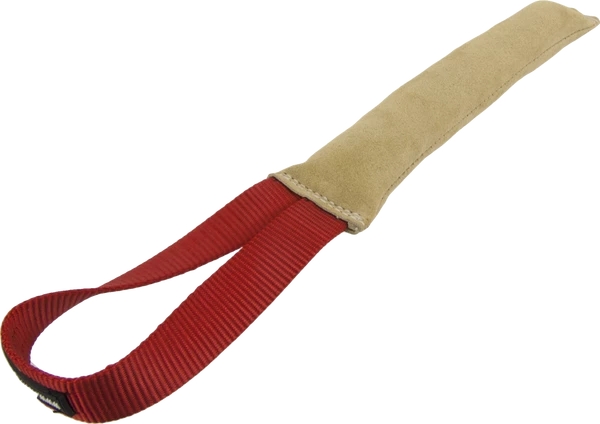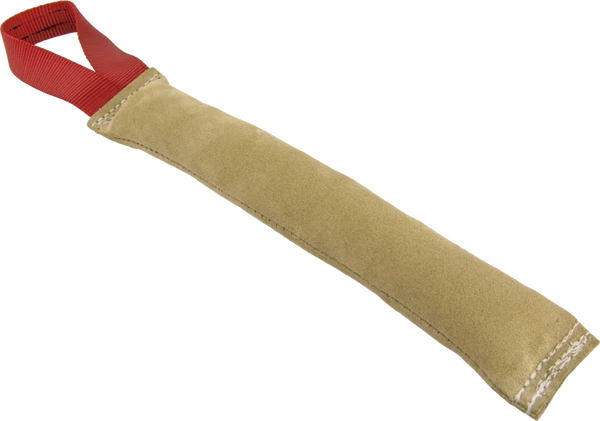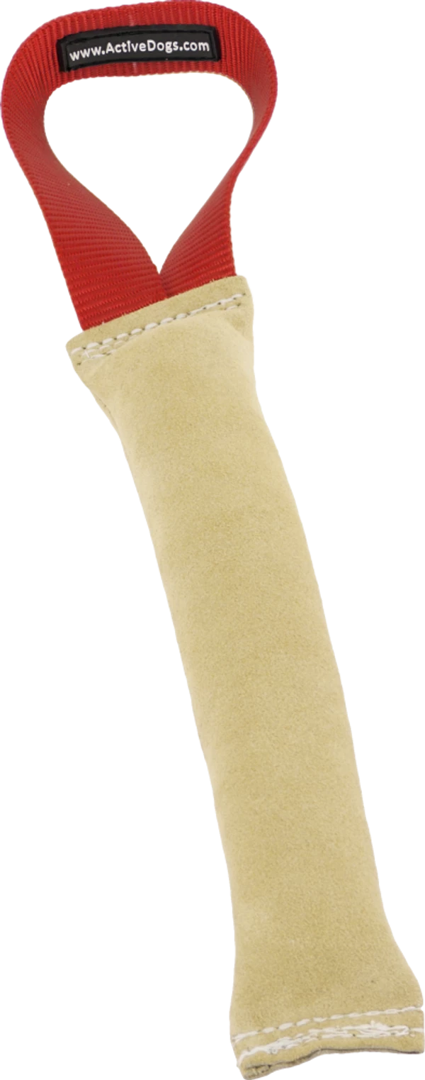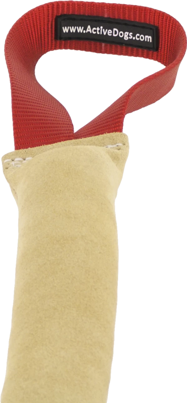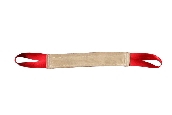 Our leather tugs are made from buttery soft shamee leather. The handles are heavy nylon and all tugs are triple stitched not glued. Puppies love to learn to bite on a leather tug as it is soft on the mouth and they feel confident to grab into it. Choose from flat rolled, single handle tug, compression tug & slap rag for puppy play.