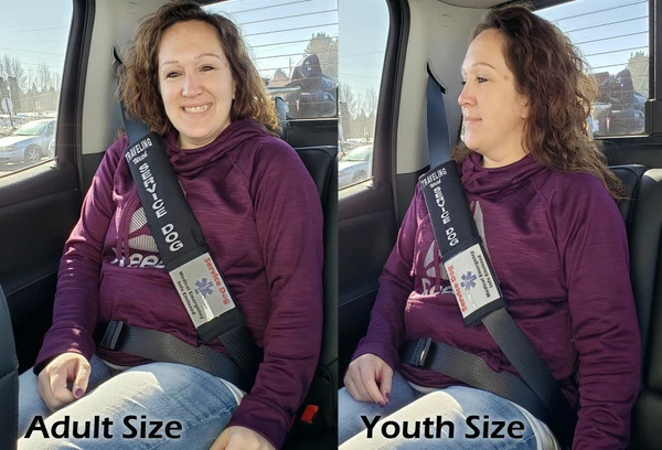 The ActiveDogs medical alert seat belt cover serves multiple purposes. It address and identifies traveling with your service dog and has a closable clear window pocket for your emergency medical information and contact information. This will be very helpful for emergency personnel in the event of an emergency. This seat belt cover is professionally embroidered in bold letters that are highly visible. The back of the cover is made from padded quilted materials so it will be a comfortable cushion pad against the person wearing the seat belt. It opens the full length and attaches around the seat belt with Velcro. It comes in two lengths, the adult cover is 16” in length and the youth seat belt cover is 12” in length. It comes with the Medical Emergency Card that you list your information on the inside. Choose from 13 color choices, these are the same colors that the ActiveDogs service dog vests and harness are offered in.