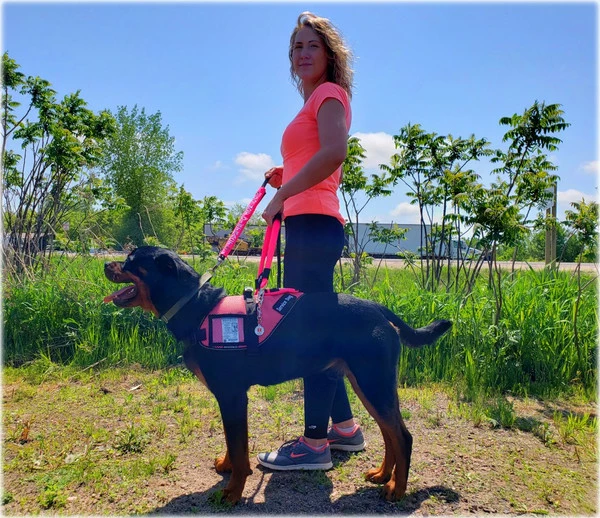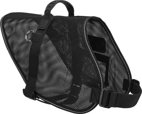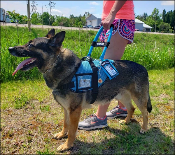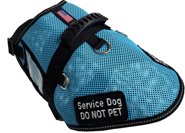 The Mesh Vest with Handle is done in the same style as our S&R Style Harness Vest and will fit your dog in the same way. This is a great vest as it has all the same features with the comfort of air breathing mesh fabric. A great vest for summer and for dogs that need to work in the heat. The Mesh Vest w/Handle features additional side D-rings for using the bridge handle (sold separately). The shorter attached handle is made from easy grip molded rubber materials. There is a clear vinyl pocket for your ID or other important papers on the side of the vest. The entire Mesh Vest w/Handle is bound in reflective webbing for night safety. On top of the vest, there is a heavy welded D-ring for attaching your leash. The chest strap has a two-way adjustment. The girth strap is adjustable and allows your dog the mobility that it needs to work, run, and jump. Comes in 9 colors, red, blue, black, coyote brown, yellow, pink, aqua, lime, orange. This vest comes in four sizes. MADE IN THE USA