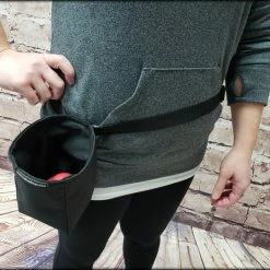 This is a perfect pouch for your tennis balls, XL Kong or reward treats. Reward balls and treats are great motivators to use during dog training but are not always conveniently accessible. This is where this pouch comes in handy. It is made from water repellent durable material. It can easily be fold up and stored when not in use. The pouch is lined giving it a long life use. It comes with an adjustable belt. This belt will fit a waist between 28-52″ inches. The pouch can also be used on your own belt and will fit up to a 2″ belt with 2 adjustable loops making it easy to achieve the right height. Pouch size is approx 4″ wide, 4″ deep, and 6″ tall.