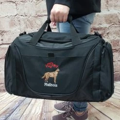 The dog breed of your choice will be stitched on the bag using high thread count, beautiful embroidery. The text reads: “I (heart) My”, then the dog breed (optional), and the name of the breed. We will embroider your personalization on the end panel for FREE.