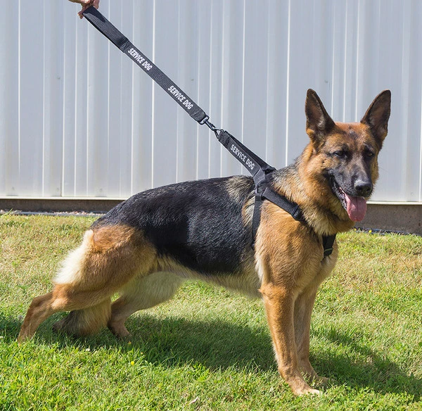 Three words describe this harness & leash: Quick, Secure, Identifying. This harness and leash set are a step in style harness set. It is so quick to put on the dog because you lay the harness open on the floor and the dog steps into the harness and then you simply pull the harness up over the dog’s shoulders and snap it together. It is a secure harness because the harness fits around the dog’s girth, shoulders, and the chest so the dog cannot back out of this harness. The chest strap of this harness is wider for the dog’s comfort which is less stress on the dog. We use this style of harness when we treadmill our dogs for that very reason. And this harness is highly visible identifying your working dog with large text on both the harness and leash.