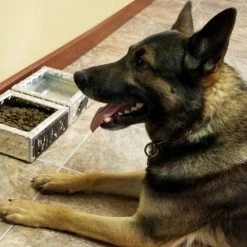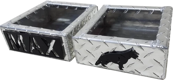 This set is made out of diamond tread aluminum for strength and longevity. On the food bowl there can be up to 8 characters of personalized text, and with the water bowl there are many breeds to choose from. These items have a water tight seal and are professionally hand crafted for a great look while retaining the durable quality. The edges of these bowls are rolled to have a safe and smooth surface for your dog. Located on the bottom are clear vinyl bumpers to keep them from sliding on smooth surfaces. Designed and made in the USA by Activedogs.com.
