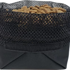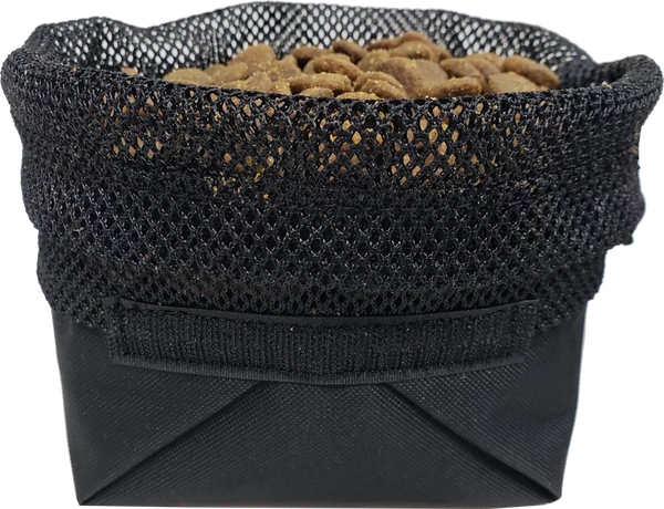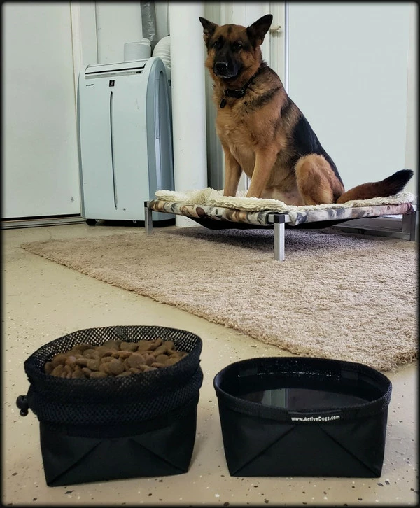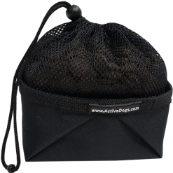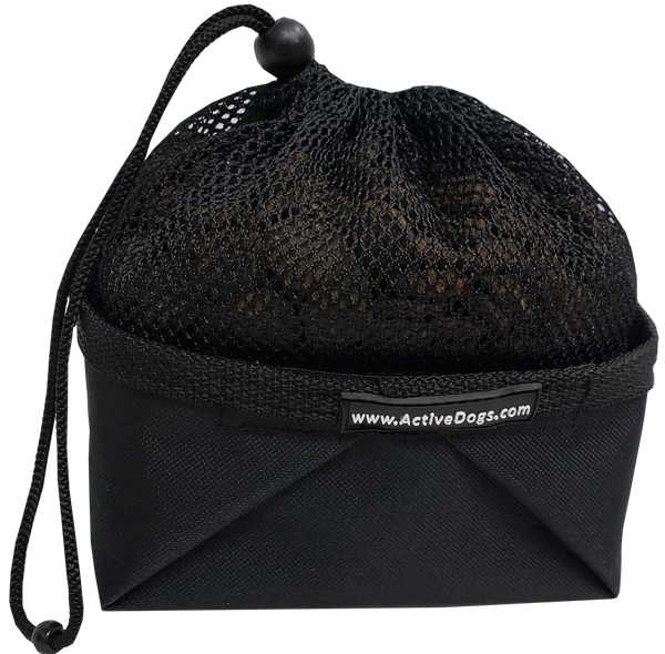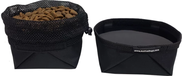 Our activedogs.com Portable Food & Water Dog Bowl Set are easy to use and convenient to have on hand when traveling or even for day trips. These pvc backed bowls are built with extra tough durable material that are also leak proof. The portable food & water bowls easily store in one another with hook and loop fastening so you don’t misplace one. The food dish has a drawstring netted top so food will not spill out while traveling, the water dish has an open top making it easy for the dog to drink out of. These dishes are just the right size for travel and when you are done they can be tossed in the washing machine to clean or can be wiped out with a damp rag. The food dish holds approx 8 cups of food. The water dish hold approx 40oz of water. Made in USA