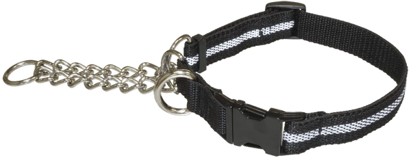 The Martingale Training Dog Collar is made with two layers of webbing. The top layer of webbing is reflective. A metal martingale chain, contoured side release buckle, and welded D-ring are used, making it more durable.