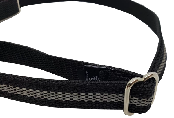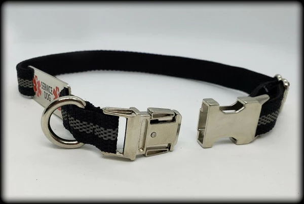 The Reflective Service Dog Chrome Tag Collar has a wide reflective band running through the collar. Reflective materials add a safety feature to this collar. The side release buckle, adjusting slide and tag on this collar are all chrome metal hardware. There is a beautiful high quality chrome Service Dog identification tag that is built into the collar. This identification tag can be moved and positioned along the collar to the desired position. The Reflective Service Dog Chrome Tag Collar is double stitched throughout. The collar is adjustable and comes in three size choices. The activedogs.com reflective service dog collar is Made in the USA. Matching Leashes available.