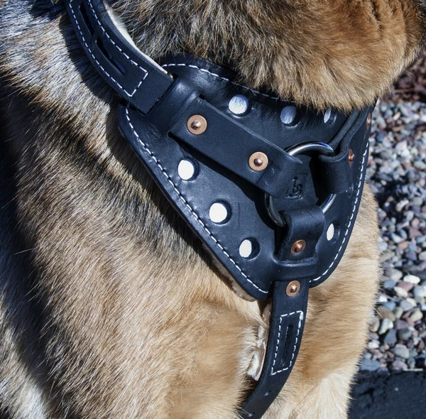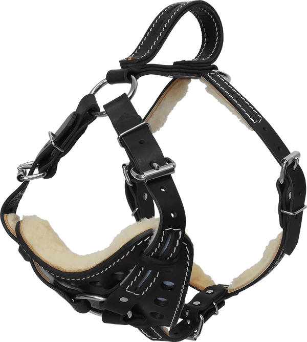 This harness has everything for a true all day working harness. I have used my harness like this for 20 years. I’ve used it to do a pedal bike endurance title, to do agitation work, and many other tasks. The handle is just where you need it to be. The thick real sheepskin will become a little more condensed as times goes on and the leather more flexible. As time goes by and the harness breaks in you can adjust by placing the straps to a tighter position. Offered in four sizes. Made in the USA by Activedogs.com craftsman.