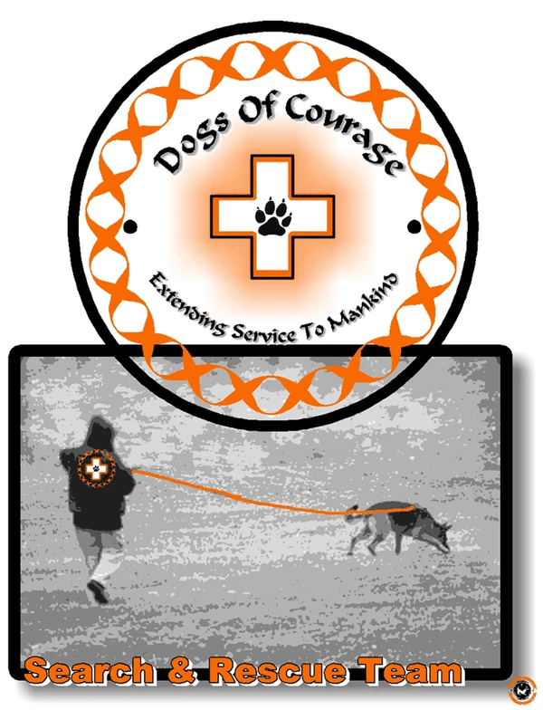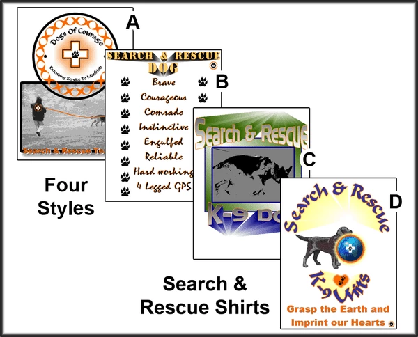 S&R Tracking Dog Team – On the front of this shirt is a picture of a dog & handler tracking team. Above them is the white red cross symbol and the words “Dogs of Courage” and “Extending Service to Mankind,” there are two small paw prints located on the left sleeve.