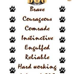 Word Description of S&R Dog – On the front of this shirt is a word description imprinted that describes the attributes of the hard working Search & Rescue dogs. There are two small paw prints printed on the left sleeve.
