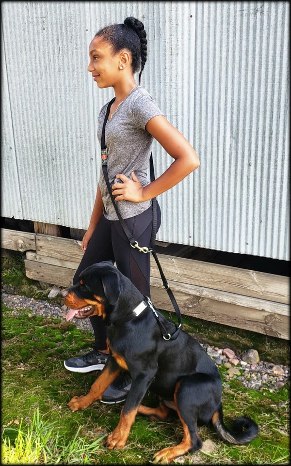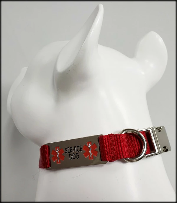 The Service Dog Chrome Tag Collar is a service dog collar with a high quality engraved tag. The chrome tag is engraved with the words Service Dog. This adjustable collar is ¾ inches wide which will work with any size dog. This is a well-made collar with sturdy all metal hardware. There are two color choices and three size choices. Matching Service Dog Hands Free Leash also available. Made in the USA at activedogs.com
