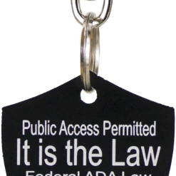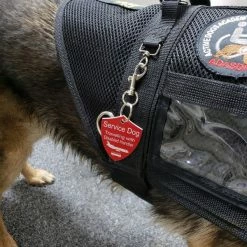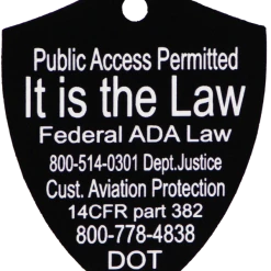 The Engraved Service Dog Travel Tags are perfect accessory when traveling with your service dog. The tags are a shield shape with engraving on both sides of the tag. The tag reads Service Dog Traveling with Disabled Handler on one side and ADA law on the other side. This tag come with a split ring and a easy to use chrome trigger snap, making this tag easy to attach or change locations if desired. The Engraved Service Dog Travel tag is approx 2″x2.5″ making it the perfect size to clip on any collar, vest, harness, or carrier. Made in USA