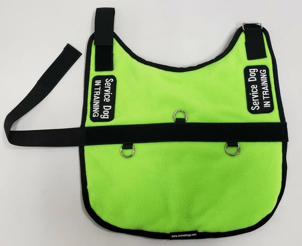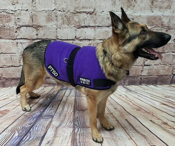 The girth and chest straps are easy to adjust with hook and loop closure so you can achieve the perfect fit. The vest also has a total of 3 d-rings on it; 2 below the girth strap & 1 centered on top. These d-rings allow you to attach additional accessories like a bridge handle, bags, id tags, or any other clip-on accessories you choose. This Service Dog Insulated Fleece Vest is a fuller cut style vest so it covers more of the dog’s back and sides for extra warmth, this also allows plenty of space for additional patches.