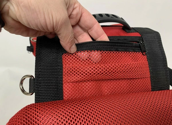 New redesigned features have been added to our Mesh Bag Vest Harness. This is a great harness style vest for carrying and transporting items that may hold moisture such as a dog water dish, water bottles, wet dog boots, towels, etc. This Mesh Bag Vest has two zippered side bags that have a solid back and bottom but, top, front and sides are constructed from a double layer mesh. This changed feature has strengthen the bags yet at the same time makes them easy to see into, light weight, and air can flow through the bags. The bags have dimensions of 3” Deep, 11” Wide and 6” Tall.