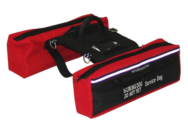 We have designed this working Oxygen carrying backpack with padding underneath the back plate that goes on the dog’s back to give cushion comfort for the dog while carrying the oxygen cylinders. The tank bags have removable padded cradles that hold the cylinder tanks secure. The bags have dual zipper heads so you can open the bags from either direction. On the outer area of the bags there are two additional pockets for extra storage, they also have dual zipper heads.
