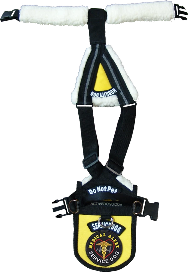 I start the training of very mobility dog with this style harness. Why, because it just works well, it’s light weight and the dog has good movement to begin having pressure and my balance on it’s shoulders. The design of this harness began with a need for a form fitting harness that stays upright on the dog while pulling a wheelchair and giving balance to the handler when they transition from the chair. A dog’s strength for pulling comes from the chest and our Pulling & Balance Harness is a safe and effective way to utilize that power. Unlike pulling a wheelchair that is attached to the dog’s collar this harness takes the stress away from the dog’s neck and it is much safer for the dog.