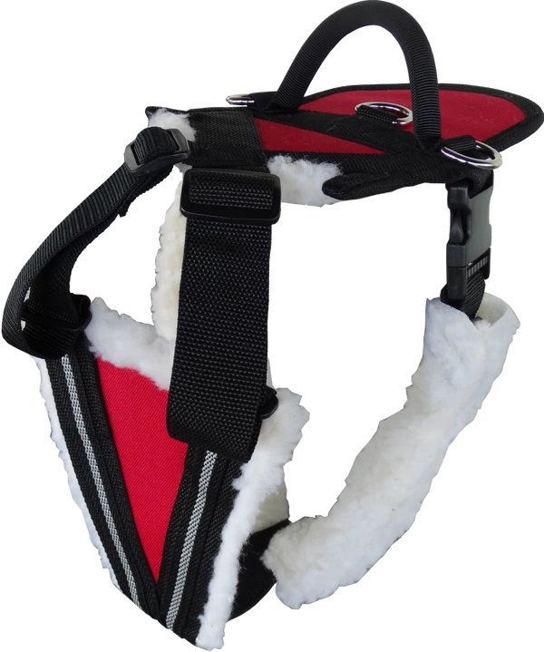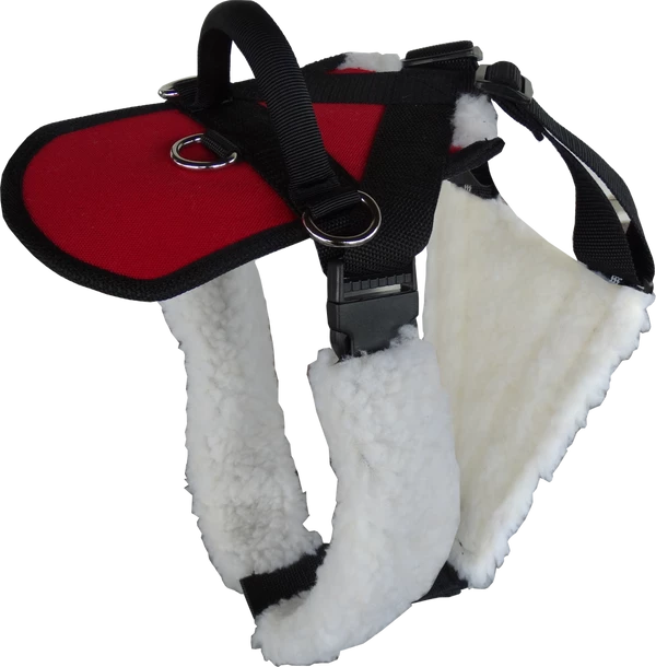 The front chest straps have double adjustments. The girth has two side release buckles and adjusting slides. All the stress points on the dog are padded. The underside of both the back plate and chest plate are felted, and then covered with sherpa. The girth strap has two removable washable sherpa covers. The back and chest plates are covered on the top with rugged 1000 denier materials.
