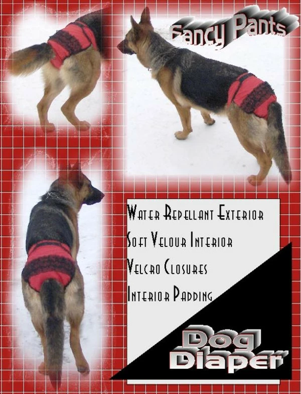 This item if for a set of three pair of Fancy Pants. These dog diapers aka “Fancy Pants” are a solution to your female dog spotting problem while she is in heat. I recently had two females in heat at the same time. Most of my dogs are indoors at night so I purchased a dog diaper. It was soft flannel on the interior and soft cotton on the exterior and I put a pad on the inside of it. The problem was that there was not enough protection and by morning the mess had come through the diaper. Not to mention she wanted to lick so getting it wet from the exterior was another problem that did not help matters. After a few days of this I set out to invent a better solution and our “Fancy Pants” are the problem solver. These are also handy pants for those older dogs that may be having problems holding their bladder. Our Fancy Pants are made of soft water repellant exterior and a soft fabric interior. In the bottom area we have sandwiched washable padding between the layers of fabric. No need to add a pad to these diapers as the pad is already built into them. The legs and flank area have elastic so they fit snuggly and stay on. And do they stay on, yes indeed; one of my young females jumped out of my low window and squatted in the yard did her business and ran back over to me with diaper and the contents all in tact. As long as my girl had to wear these I thought why not be fancy so that is where all the lace came into the picture. Now if your have a conservative girl we also have just plain black no lace “Fancy Pants”. They are made just the same as the red pants, less the lace. These are machine washable and machine dryable and they wash up beautifully. Choose from 5 sizes and two colors. See the Measurement page to insure you order the correct size for your dog.