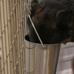 We are fond of these pails and use these flat sided pails everyday in our kennels. The flat side help keep the pail against the kennel and that means less water splashing out. If you want the best and safest for your dog then use stainless steel pails. This is a flat sided stainless steel pail perfect for crate or kennel. All of our Flat sided pails have no exposed wires on them. Exposed wires are dangerous and dogs tend to catch their collars on them. No more spilled water in the crate with a flat sided pail that can attach and hang inside the crate. Nothing worse then arriving at training and your dog is wet from laying on his/her wet crate floor. Our Aluminum crates have a bar welded inside the crate door to attach these quality stainless steel pails with the double bolt snap. Four sizes available, double ended snap hook sold separately.