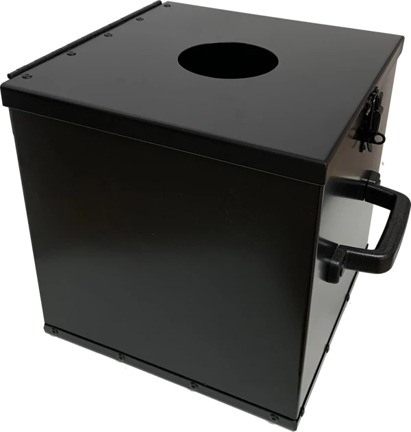 These heavy duty steel scent boxes are very durable. These boxes have a black powder coated finish. They are made with 1/16” steel, have a resilient handle and a 4″ wide scent hole. It’s hinged with a pull-down catch lock for securing the lid. Made in the USA.