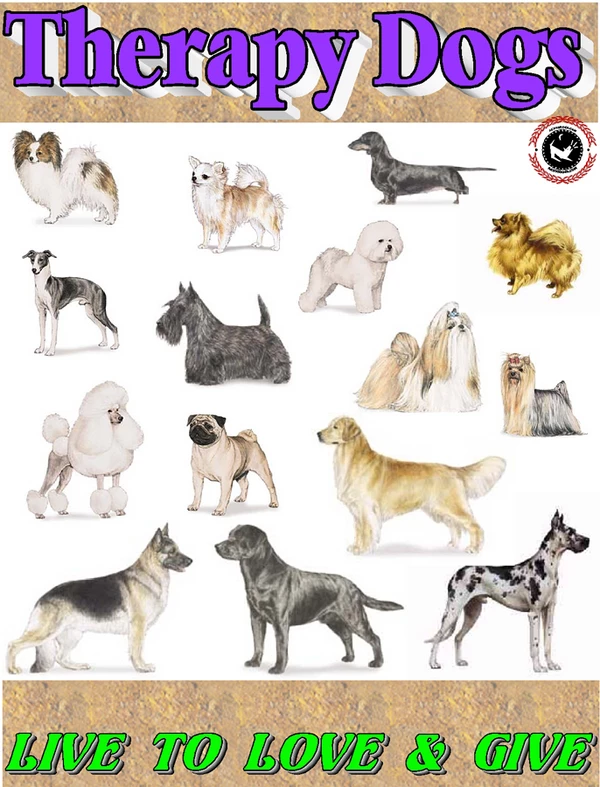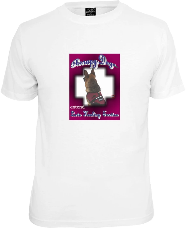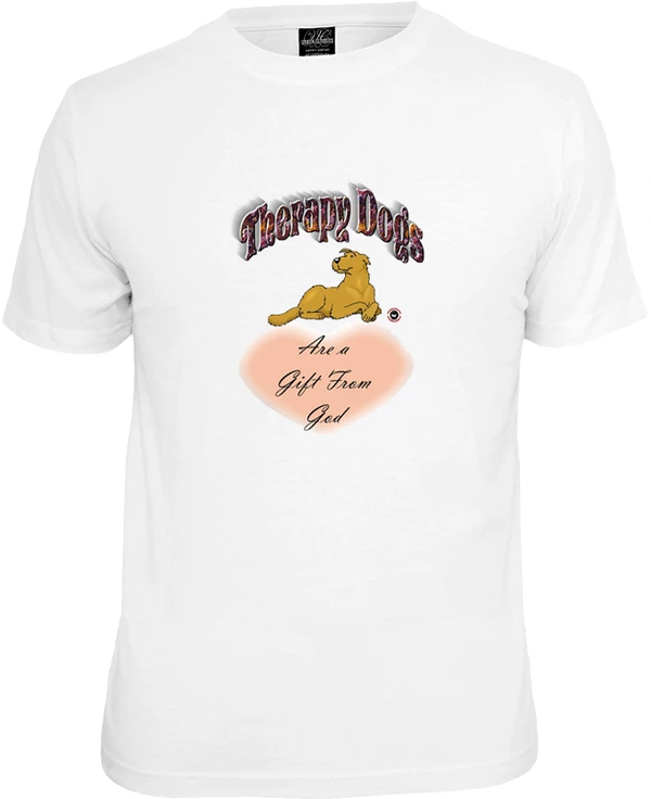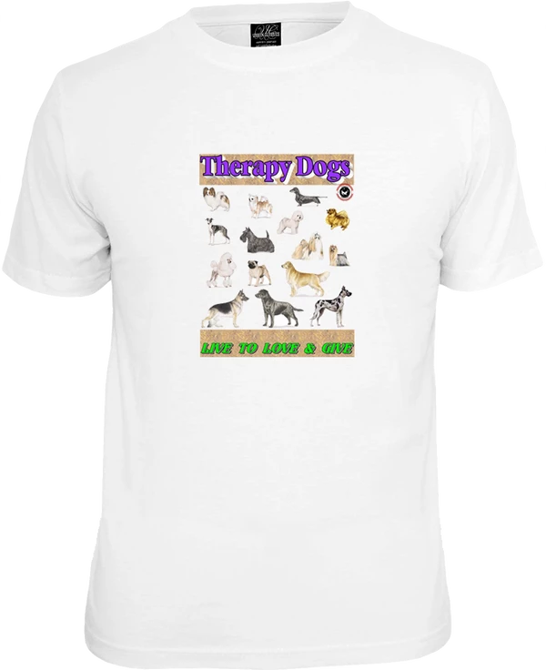 Our Therapy Dog T-shirts are available in four sizes and four different designs. They are a 100% polyester. The designs are permanent dyed. These T-shirts are durable, washable, and dry beautifully.