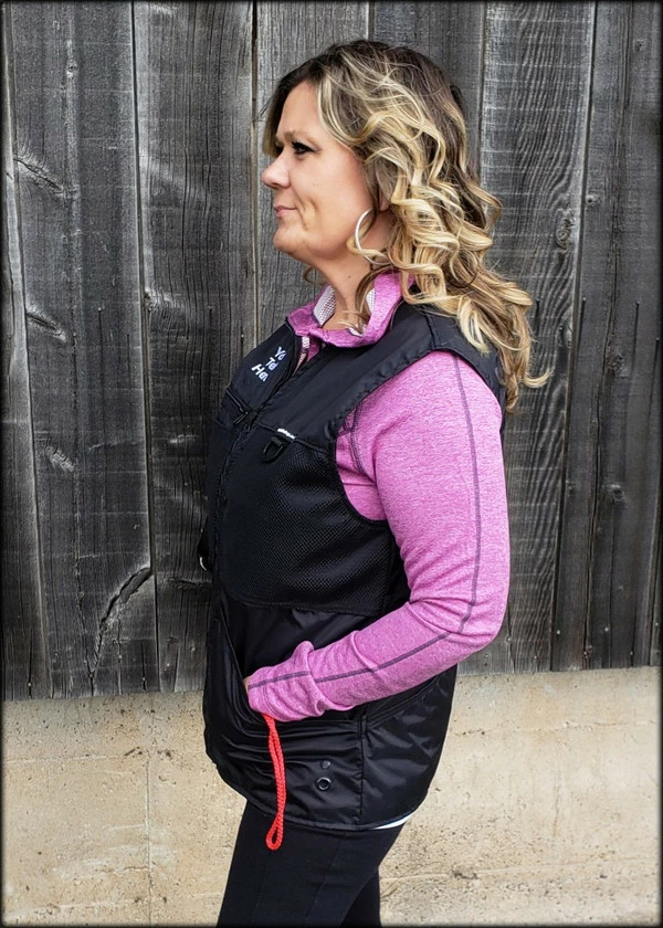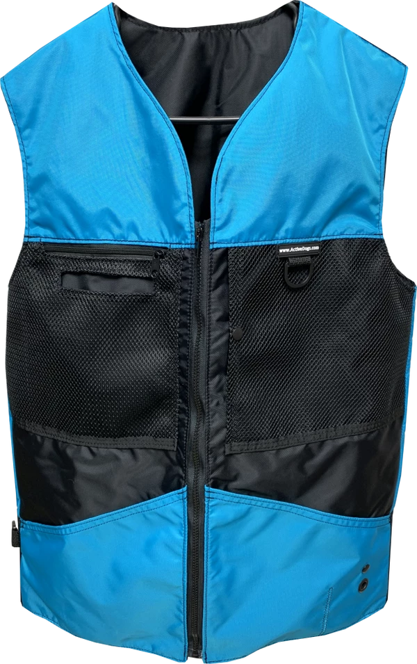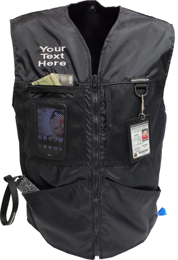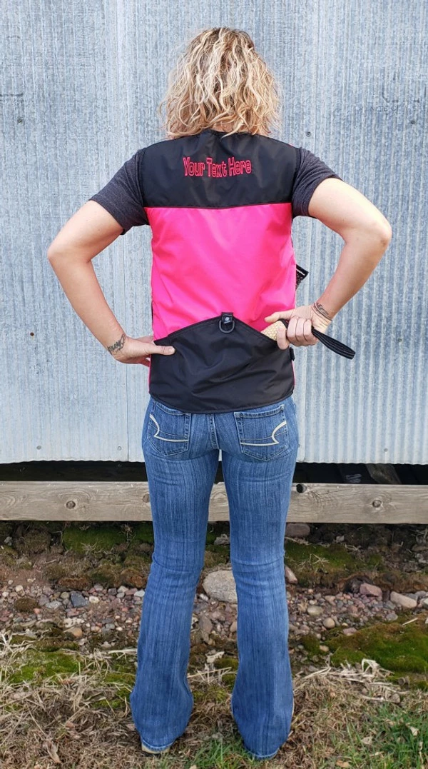This vest was designed with a specific purpose in mind. I not only required storage in my handler vest but I wanted identification. When I am in public training a service dog I have often thought I should design an embroidered back handler vest stating “Service Dog Trainer” so people will not disrupt me while I am training. The Trainers Choice Embroidered Handler Vest does just that. This vest comes embroidered if you choose or you can have it with no embroidery. It is light weight without restriction in the neck and armhole areas so you have easy movement. It is fully lined, no scratchy seams and has a full front molded zipper. Another issue is always that pesky dog hair but dog hair dose not stick to this fabric. The vest is easily cleaned by wiping off with damp towel. Lots of pockets and D-rings on this vest, you can never have too many storage pockets. There are 7 pockets on this vest. The back has a full width pocket that can be accessed from either side, with a top center D-ring. I like this D-ring for hanging of a short pull tab or a small tug. On the front of the vest there are two large lower pockets. The top area of the vest has a great side opening mesh pocket, this works well for draping a tug or roped ball and letting the dog see it for motivation. On that same mesh pocket there is another D-ring at the top, this can be used for the same purpose. It also works great to hang a remote controller. The other side of the top has a double pocket. A mesh pocket with top opening, this is where I put my phone so I can easily hear and see it. Behind that mesh pocket is a zippered pocket, a good feature if you want to secure keys or smaller loose items. One of the best features of this vest is the built in poop bag holder. The bags are easily accessible from the vest exterior. Convenient to load on the vest lower left side. The lower right side of the vest has another D-ring. This work for hooking your leash. We will custom embroider this vest for you. You can have your text and/or logo put on the vest front. The Trainers Choice Embroidered Handler Vest is black in color and comes in five sizes. USA MADE