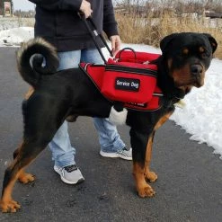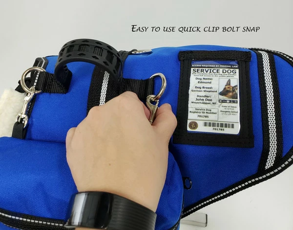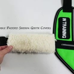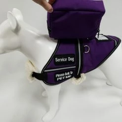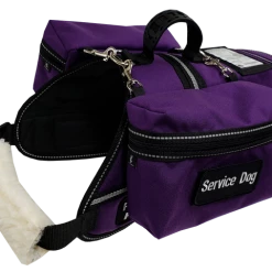 On the top back section of this vest is a vinyl window pocket to put your dog’s ID Badge with velcro closure to secure it in place. This window pocket will fit all ID Badges made by ActiveDogs. The rubber molded handle is placed vertical for comfort and easy access. There are 4 reflective strips on the vest and the entire vest and additional bags are bound in reflective webbing for maximum visibility & safety. There are 4 D-Rings on this vest to accommodate your bags, bridge handles, leash & other accessories. The girth and chest straps are 1.5” in width and come with padded removable sherpa covers, both are adjustable to get the best fit.