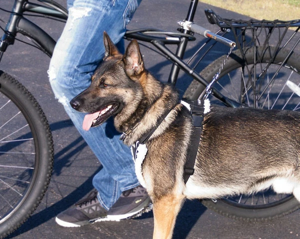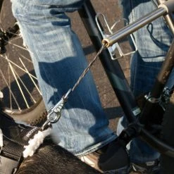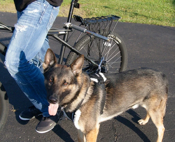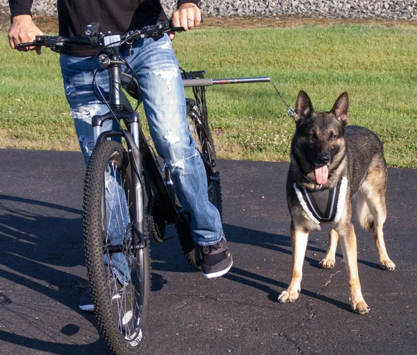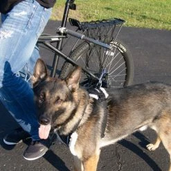 A great way to exercise the dog and yourself by biking together. We have used the Walky Dog for many years. The Walky Dog Plus has upgraded paracord leash, lightweight stainless steel bar, and quick disconnect. The spring tension and leash length can both be adjusted. The leash can be replaced with a longer leash with ease. There is one cap holding the spring/leash assembly into place. Once the cap is off just take the loop off the snap and the springs come off the leash. Make sure to keep the spring with the narrow end on the side with the knot.
